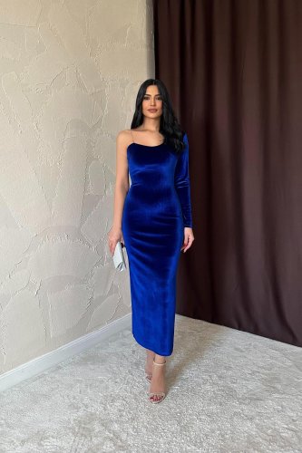 Saks Tek Omuzlu Taş Askılı Elbise