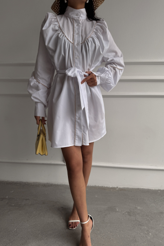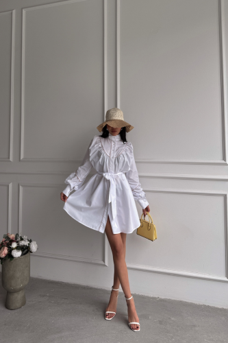 ÖNDEN DÜĞMELİ POPLİN KLOŞ ELBİSE BAĞLAMA KEMER DETAYLI - Beyaz