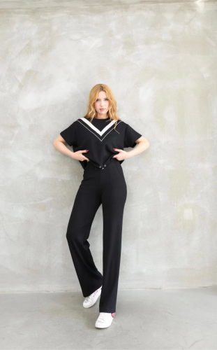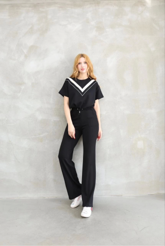 Osy Modal Yumuşak dokulu Kumaş Bisiklet Yaka Parçalı detaylı Kısa Kollu Takım - Siyah