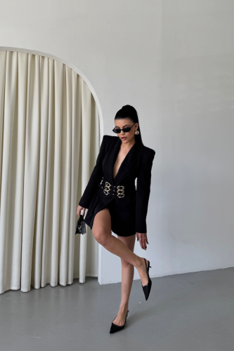 TEK DÜĞME CEKET 3 TOKALI KEMER SÜSLÜ - Siyah