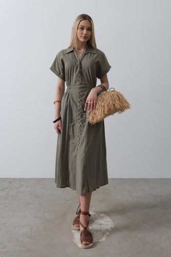 Önü Düğmeli Kısa Kol Elbise - Haki