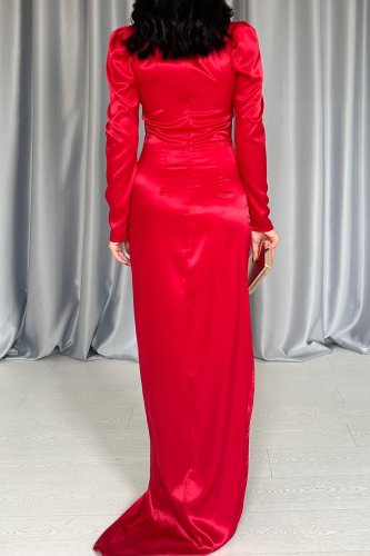 Kırmızı Göğsü Kuplu Yırtmaçlı Elbise