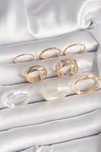 Pirinç Gold Renk Beyaz Akrilik Plastik Modek Kutup Yıldız İşleme Detay Kadın Yüzük Kombini