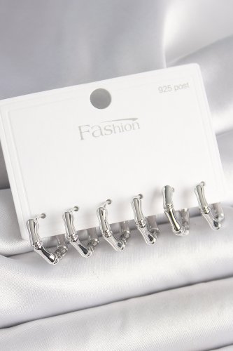 925 Ayar Gümüş Çivi Pirinç Gümüş Renk Bambu Halka Model Kadın Küpe Seti