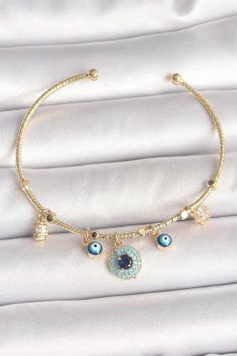 Pirinç Gold Renk Zirkon Taşlı Nazar Boncuk Detay Charm Kadın Bileklik