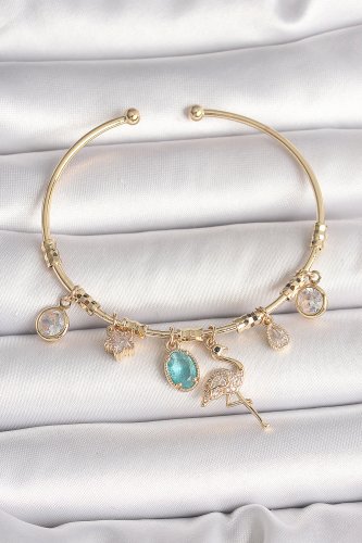Pirinç Gold Renk Zirkon Taşlı Sallantı Filamingo Figür Charm Kadın Bileklik
