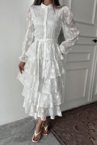 Beyaz Valonlu Şeritli Kat Kat Elbise