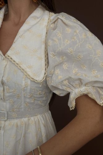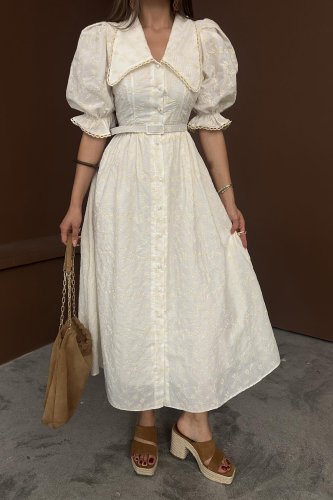 Bej Bebe Yaka Balon Kollu Brode Elbise