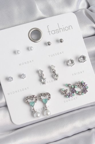 Pirinç Gümüş Renk Zirkon Taşlı Sallantılı Kalp Model Çiçek Detay 7 Çift Kadın Küpe Seti