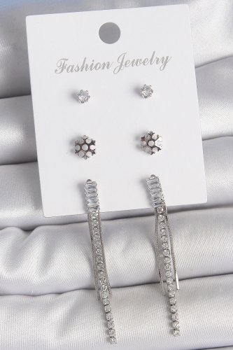 Pirinç Gold Renk Zirkon Taşlı Sallantılı Çiçek Detay 3 Çfit Kadın Küpe Seti