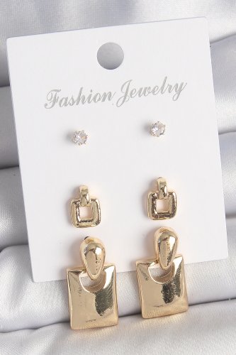 Pirinç Gold Renk Zirkon Taşlı Sallantılı Kare Model 3 Çift Kadın Küpe Seti