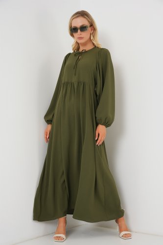 Balon Kol Uzun Tesettür Elbise 2464 - Haki
