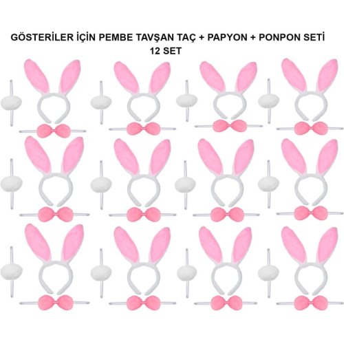 Pembe Tavşan Kostüm Seti Taç Papyon Ponpon 12li Paket