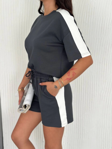 Osy Modal yumuşak dokulu Kumaş Parçalı Bisiklet Yaka T-shirt Kısa Şort İkili Takım - Antrasit