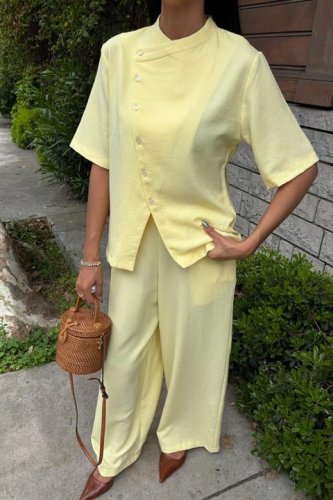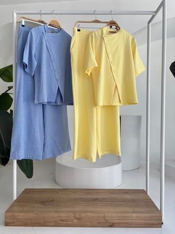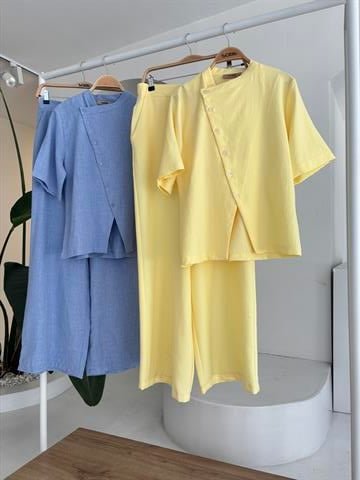Hakim Yaka Çapraz Düğmeli Plazzo Pantolon Viscon Keten Takım 10209