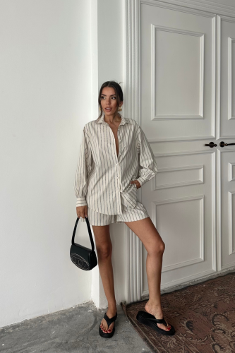 POPLİN ÇİZGİLİ GÖMLEK - ŞORT TAKIM - Bej