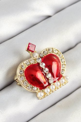 Zirkon Taşlı İnci Detaylı Kırmızı 3D Kraliçe Taç Figürlü Gold Renk Kadın Broş
