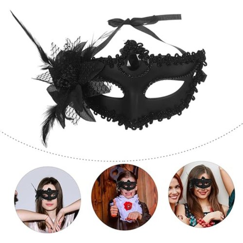 Siyah Mat Renk Yandan Tüylü Güllü Parti Balo Venedik Maskesi 16x22