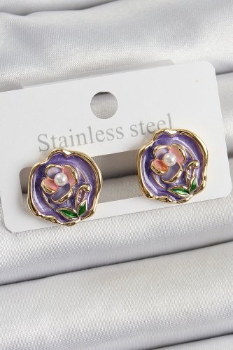 Pirinç Mor Mineli Çiçek Figürlü Sanatsal Portre Model Gold Renk Kadın Küpe