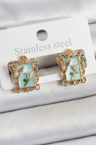 Pirinç Yeşil Mineli Sanatsal Portre Model Gold Renk Kadın Küpe