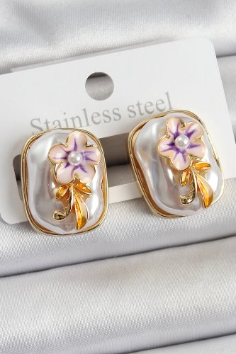 Pirinç Beyaz Mineli İnci Detaylı Çiçek Figürlü Sanatsal Portre Model Gold Renk Kadın Küpe