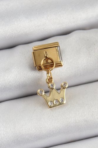 316L Çelik Sallantılı Zirkon Taşlı Kraliçe Tacı Model Gold Renk Nomination Charm