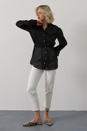 Belden Bağlamalı Uzun Kol Gömlek - Siyah