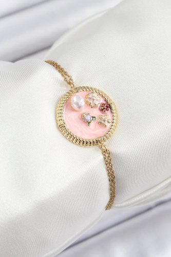 316L Çelik Zincir Pembe Mineli Sanatsal Portre İnci Detaylı Çiçek Model Gold Renk Kadın Bileklik
