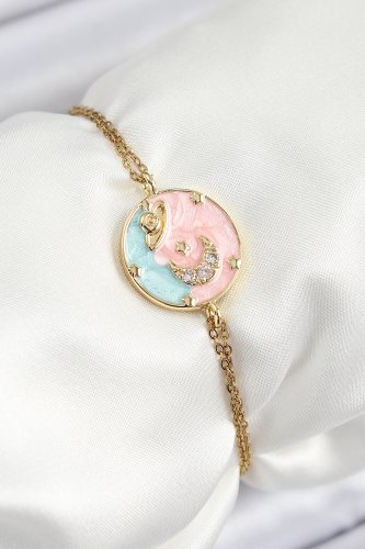 316L Çelik Zincir Mineli Sanatsal Portre Zirkon Taşlı Gezegen Model Gold Renk Kadın Bileklik