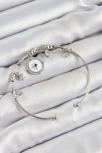 Pirinç Zirkon Taşlı Pusula Model Gümüş Renk Charm Bileklik
