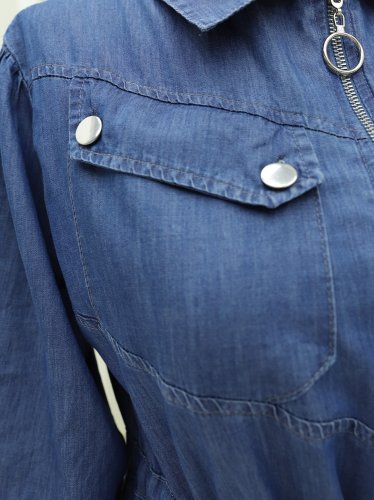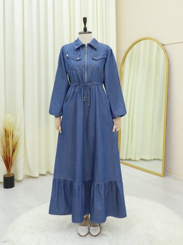 Tünel Bağcıklı Yarım Fermuarlı Cepli Kot Elbise -İndigo