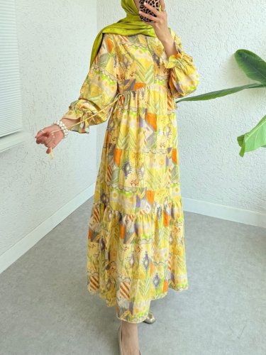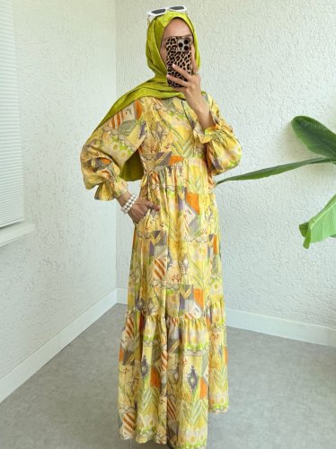 Yandan Bağcıklı Kolu Lastikli Yarım Düğmeli Viskon Elbise -Yağ Yeşili