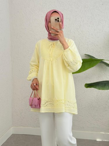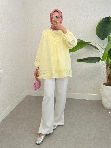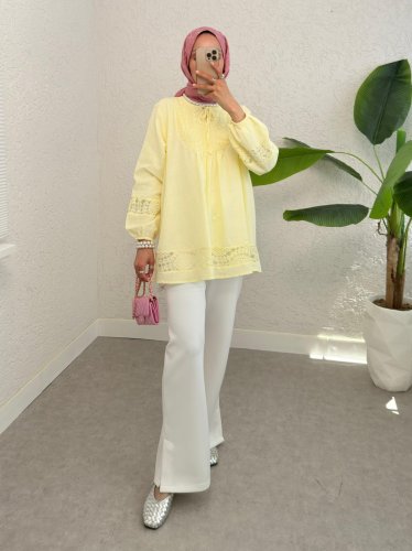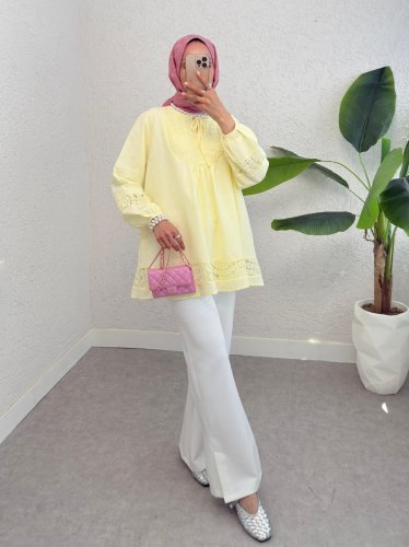 Dantel Detaylı Yakası Bağlamalı Kolu Lastikli Gömlek -Açık Sarı