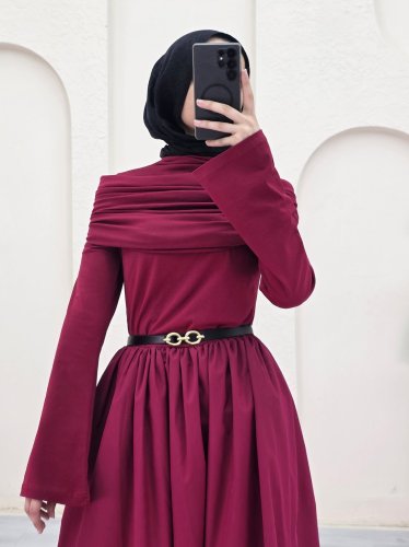 Eteği Poplin Üstü Sendy İki Parçalı Pileli Elbise -Bordo