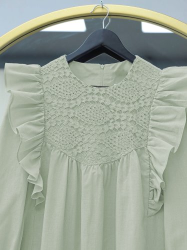 Omuz Fırfırlı Robası Dantel İşlemeli Poplin Tunik -Su Yeşili