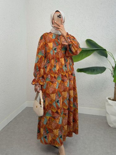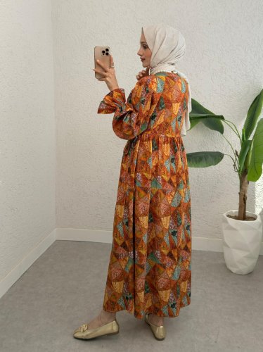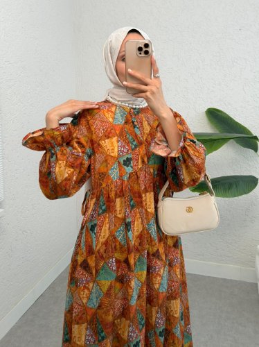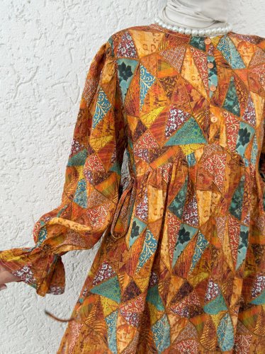 Yarım Düğmeli Beli Bağcıklı Desenli Elbise -Turuncu