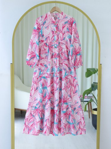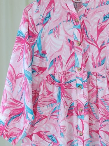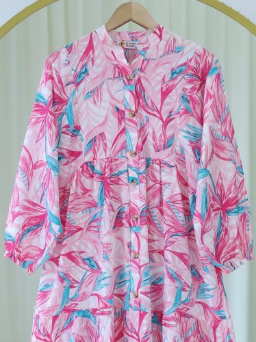 Çiçek Desenli Parçalı Kolu Lastikli Yarım Düğmeli Elbise -Mürdüm