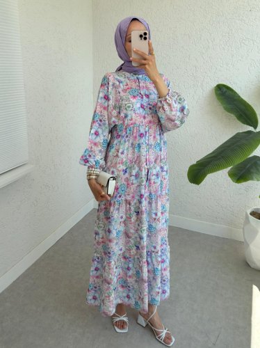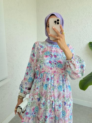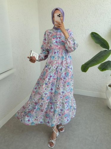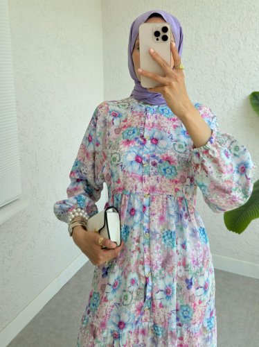 Yarım Düğmeli Kolu Lastikli Desenli Elbise -Nar Çiçeği