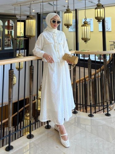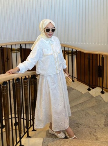 Püskül Detaylı İnci Düğmeli Etekli Takım -Beyaz
