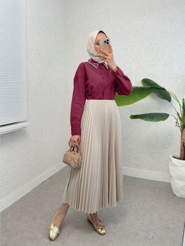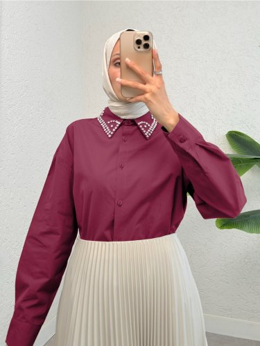 Yakası Taş Detaylı Düğmeli Salaş Gömlek -Bordo