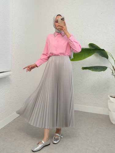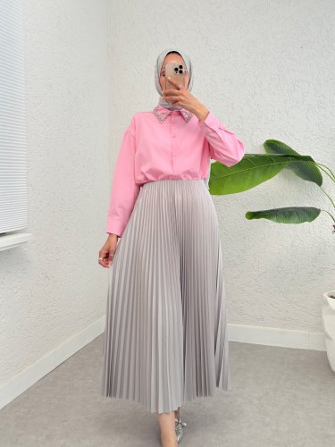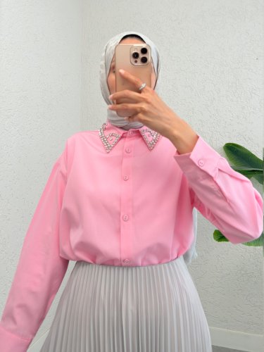 Yakası Taş Detaylı Düğmeli Salaş Gömlek -Pembe