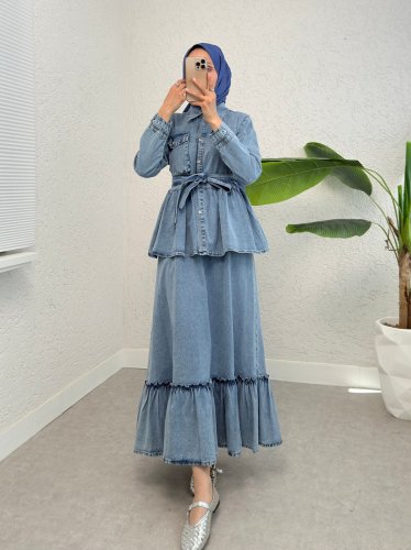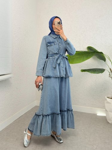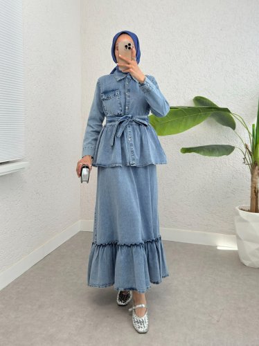 Parçalı Kemerli Jile Ceket İkili Kot Elbise-Buz Mavi