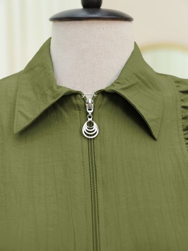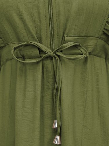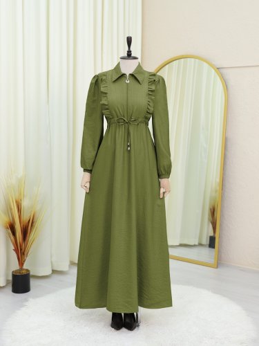 Önü Fırfırlı Yarım Düğmeli Tünel Bağcıklı Elbise -Yağ Yeşili