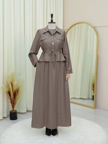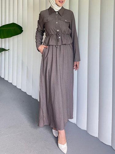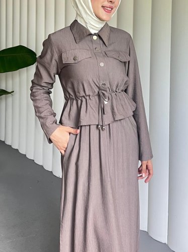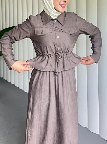 Metal Düğmeli Beli Bağlamalı Gömlek Jile Elbise -Toprak