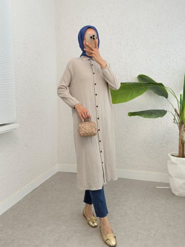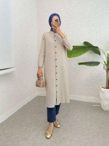 Boydan Düğmeli Kolu Lastikli Uzun Krinkıl Tunik -Taş