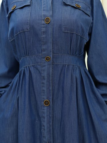 Kolu Lastikli Boydan Düğmeli Çift Cepli Kot Elbise -İndigo