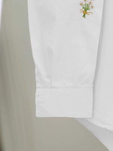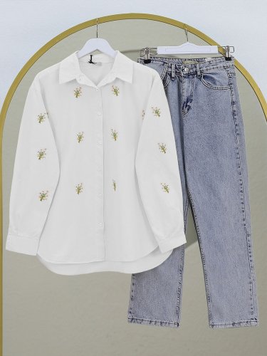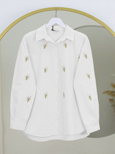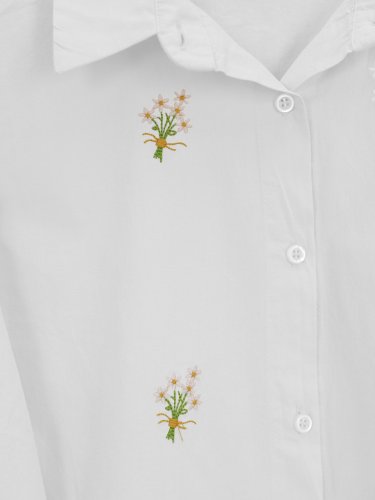 Buket Çiçek Detaylı Arkası Uzun Gömlek -Beyaz