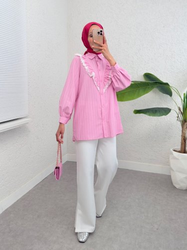 Boydan Düğmeli Önü Dantelli Fırfırlı Çizgili Gömlek -Pembe