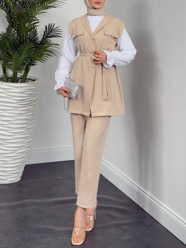 Sıfır Kol Önü Düğmeli Beli Kemerli Üçlü Takım -Bej