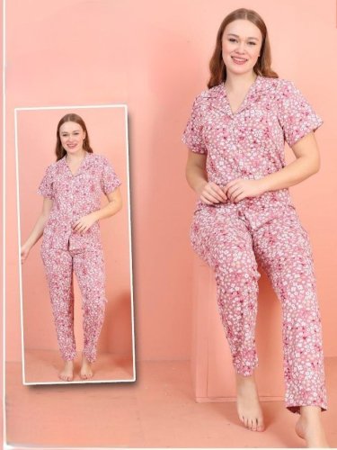 Önü Düğmeli V Yaka Kısa Kollu Pijama Takımı -Pembe